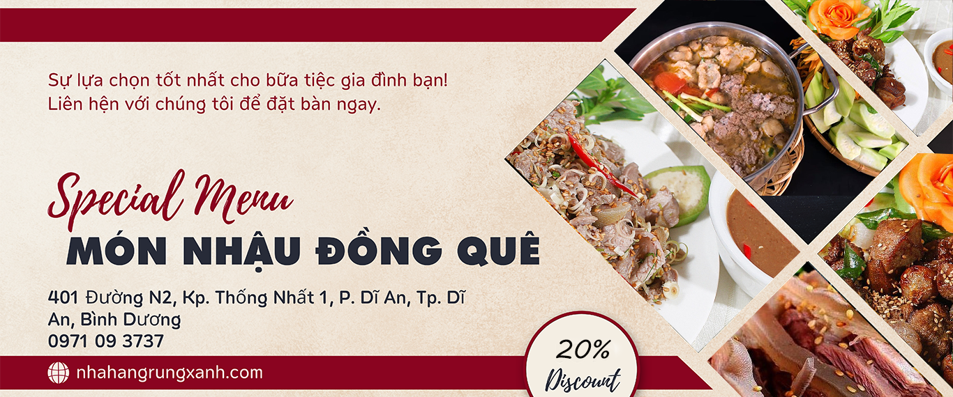 Nhà Hàng Rừng Xanh tại Dĩ An, Bình Dương, là một điểm đến ẩm thực độc đáo và hấp dẫn trong khu vực. Với mục tiêu tạo ra trải nghiệm ẩm thực độc lạ và sự phục vụ chuyên nghiệp, chúng tôi tự hào giới thiệu đến quý khách hàng một không gian tươi mát và thực đơn đa dạng đầy hấp dẫn.